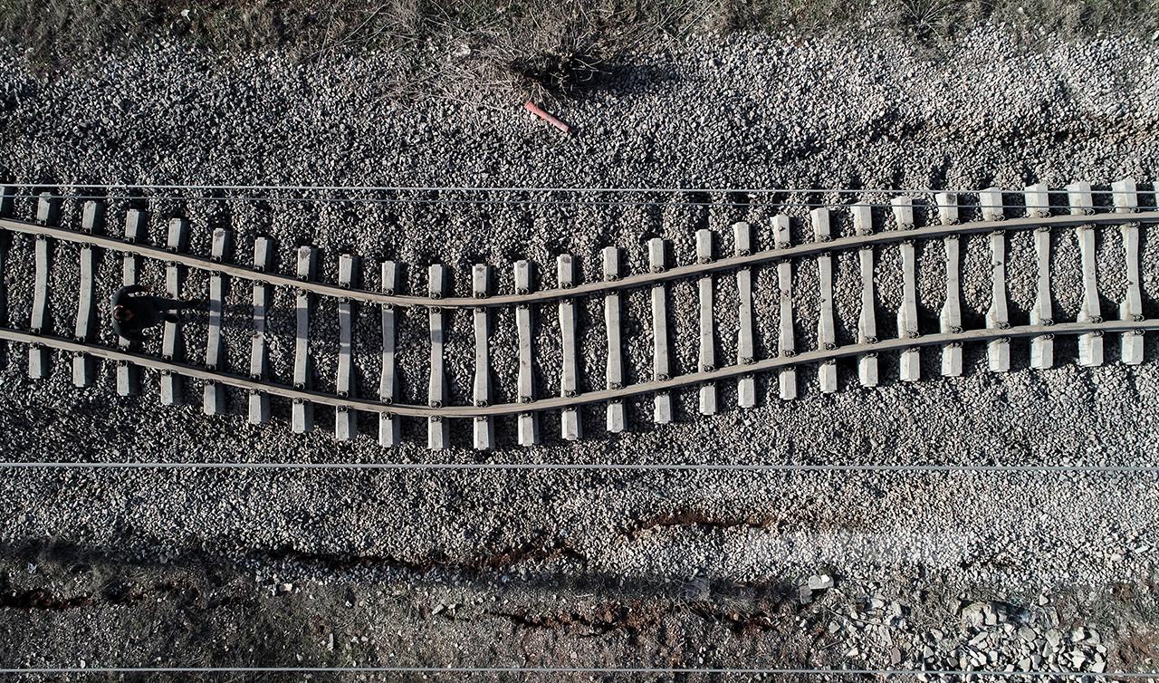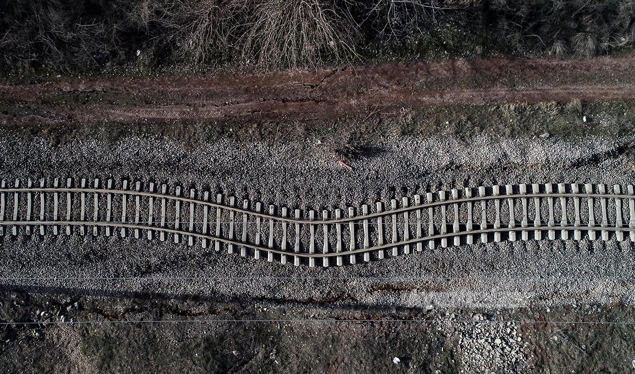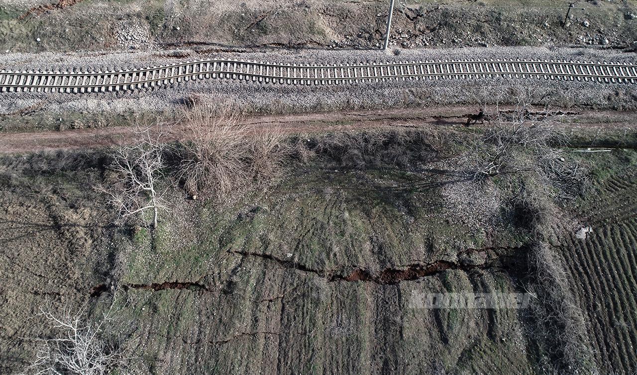 Demir yolu gibi yapıların yüzey kırılmalarında hassas olduğunu belirten Uçkan, "Bu tür uzun elemanlar, yüzey yırtılmasında atım yönüne bağlı olarak birtakım deformasyonlara uğrayabiliyor. Buraya baktığımız zaman fayın, tren yolunu kestiğini görüyorsunuz. Fay, tren yolunu kestiği zaman atım yönüne göre 'S' ya da 'Z' şeklinde deformasyon yapabilir. Burada daha böyle 'S' şeklinde deformasyon görebiliyorsunuz." dedi.