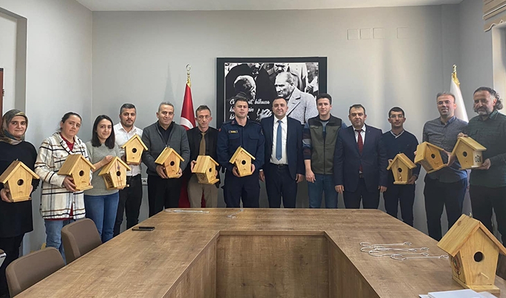 Kaymakam Türk, okul idarecilerine okul bahçelerinde bulunan ağaçlara asılması amacıyla yaptırılan kuş yuvalarını teslim etti.