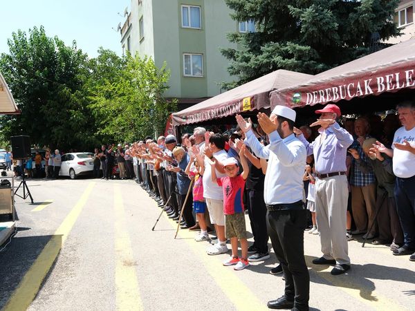 Derebucak Merkez Camisi önünde toplananlar, yağmur duasına katıldı. Kur'an-ı Kerim tilaveti ve ilahilerin ardından İlçe Müftüsü İhsan Bölükbaşı dua etti. Duanın ardından katılımcılara Sosyal Yardımlaşma ve Dayanışma Derneği tarafından yemek ikram edildi.