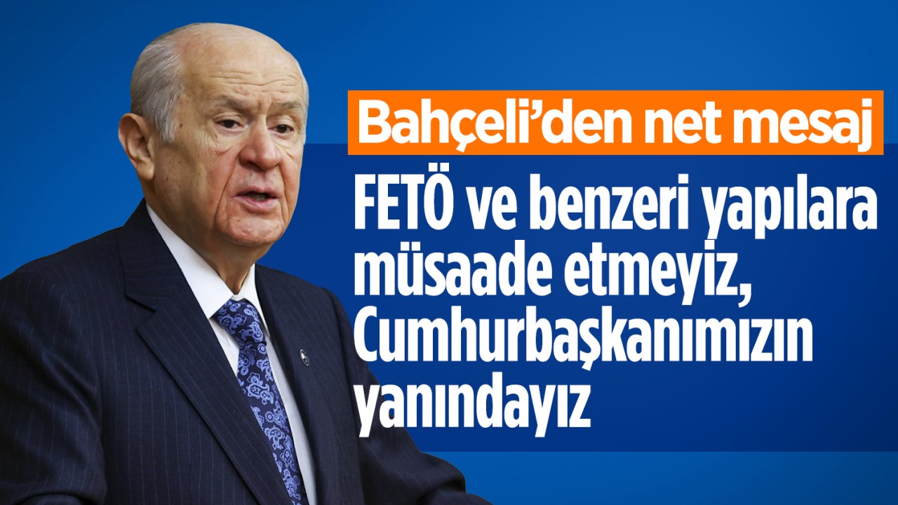 MHP Genel Başkanı Devlet Bahçeli, "FETÖ ve FETÖ benzeri yapıların devleti zehirleyip devlet içinde feodal ve imtiyazlı alanlar oluşturmalarına kesinlikle müsaade etmeyeceğiz. Bu süreçte Sayın Cumhurbaşkanı'mızın yanındayız, devlet ve milletle ortak kaderin ta merkezindeyiz." dedi.
