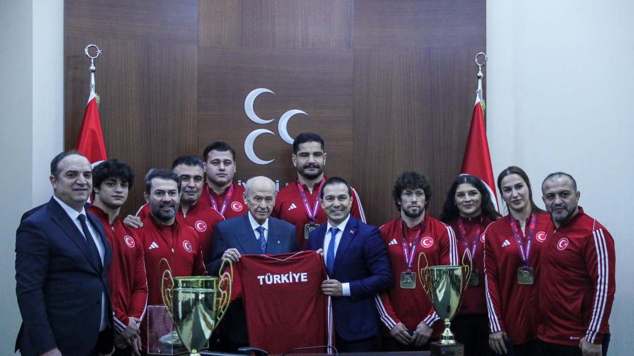 Türkiye Güreş Federasyonu Başkanı Dr. Şeref Eroğlu ve Serbest Güreş Milli Takımı Teknik Direktörü Abdullah Çakmar, Grekoromen Güreş Milli Takımı Teknik Direktörü Nazmi Avluca, Kadınlar Güreş Milli Takımı Teknik Direktörü Efrahim Kahraman, Avrupa Şampiyonası’nda madalya alan güreşçilerimiz Buse Çavuşoğlu, Nesrin Baş, Selçuk Can, Alperen Berber, Taha Akgül, Rıza Kayaalp ve MHP Spor Komisyonu Başkanı İbrahim Özbay’ın da katıldığı görüşmede, MHP Genel Başkanı Dr. Devlet Bahçeli, madalya alan ve üstün başarı gösteren güreşçilerimizi tek tek tebrik ettikten sonra hediyelerini verdi ve tekrardan başarılarının devamını diledi.