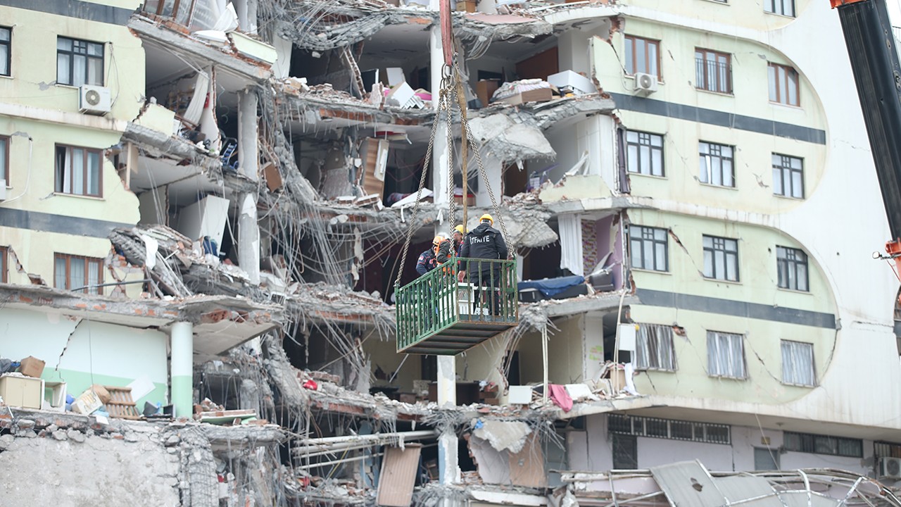 İtfaiye ve AFAD ekipleri dünden bu yana vinçlerle binada belirlenen noktalara kafes koyarak, hassas bir şekilde çalışma yürütüyor.