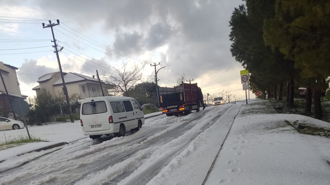 İzmir'in Çeşme ilçesinde etkili olan dolu nedeniyle plaj ve caddelerde ilginç manzaralar oluştu.