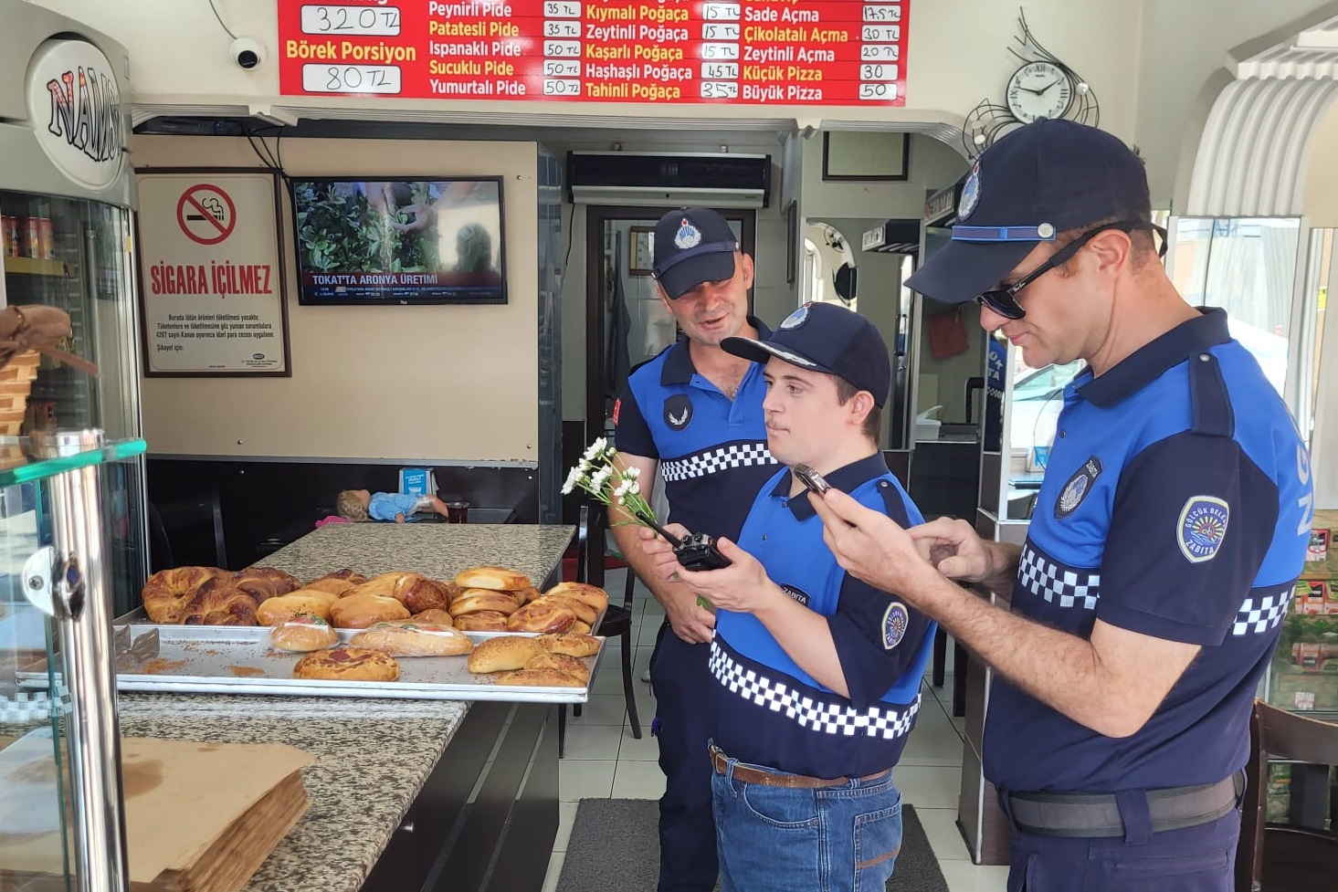 Kocaeli’nin Gölcük ilçesinde down sendromlu Mustafa Erol (31), en büyük hayali olan bir günlüğüne zabıta oldu. Elinde telsizle esnafı denetime çıkan Erol, tebessümle karşılandı.