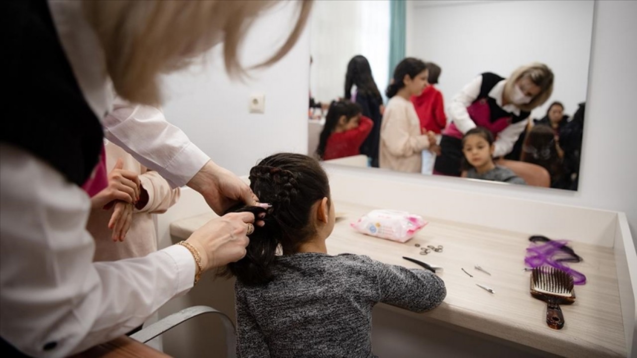 Gençlik ve Spor Bakanlığının Çubuk'taki kız öğrenci yurdunda misafir edilen yaklaşık 500 kadın ve kız çocuğu, kuaförlerin ücretsiz etkinliğine katıldı.