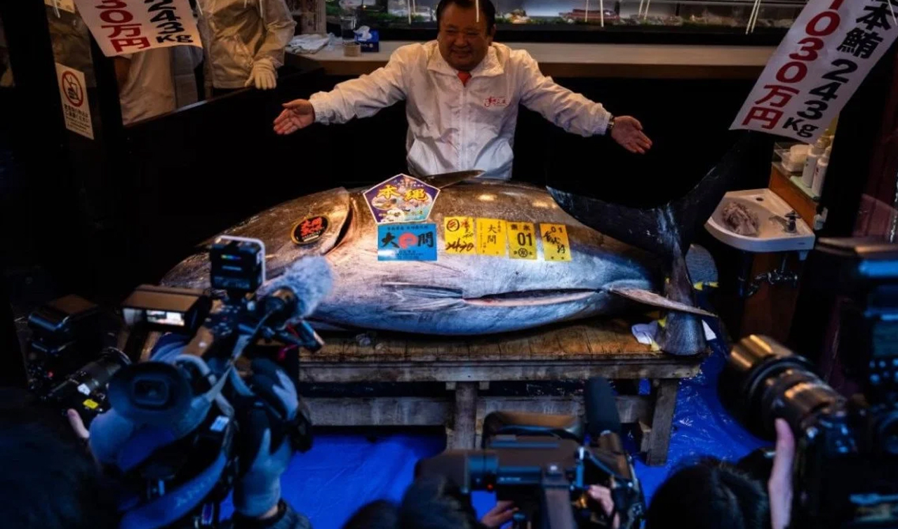 Tokyo’daki Toyosu balık pazarında 2026 yılının ilk açık artırmasında, 243 kilogram ağırlığındaki dev bir mavi yüzgeçli orkinos 510 milyon yen (yaklaşık 3,2 milyon dolar) bedelle satılarak tarihi bir rekor kırdı.