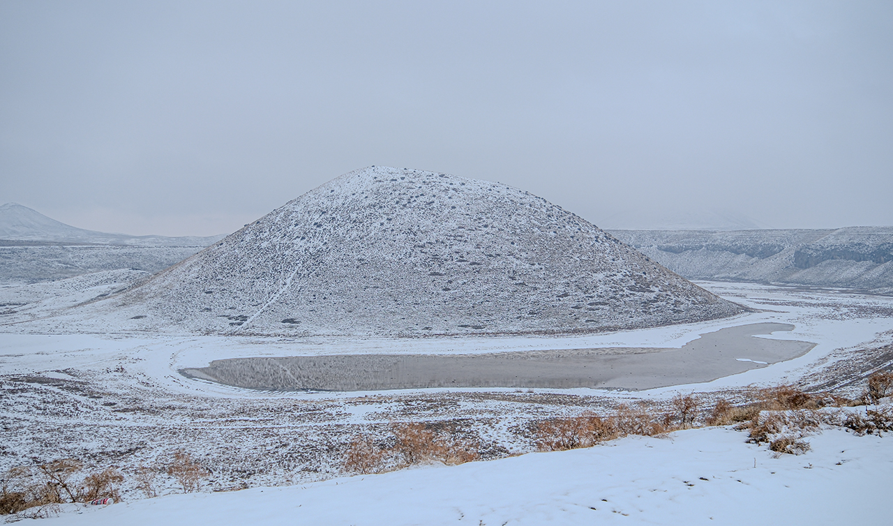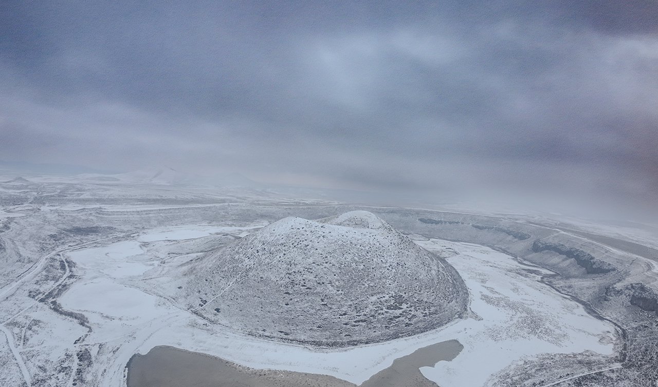 Karapınar'ın en önemli doğal güzelliklerinden birisi olan Meke Krater Gölü, kar yağışının ardından beyaza büründü.