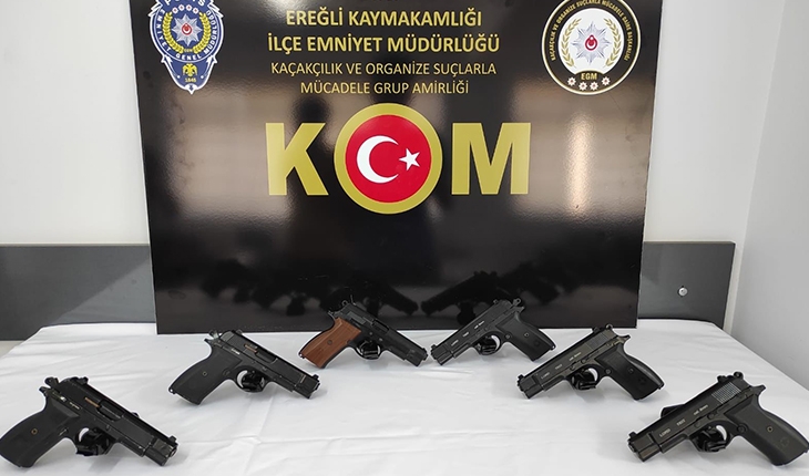 Konya'nın Ereğli ilçesinde polis ekiplerinin dur ihtarına uymayarak kaçan şüpheliler yaşanan kovalamacanın ardından yakalanarak gözaltına alındı. Kovalamaca sırasından şüpheliler tarafından araçtan atılan 6 tabanca ekipler tarafından bulundu.