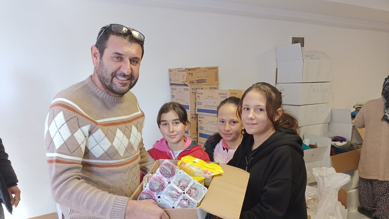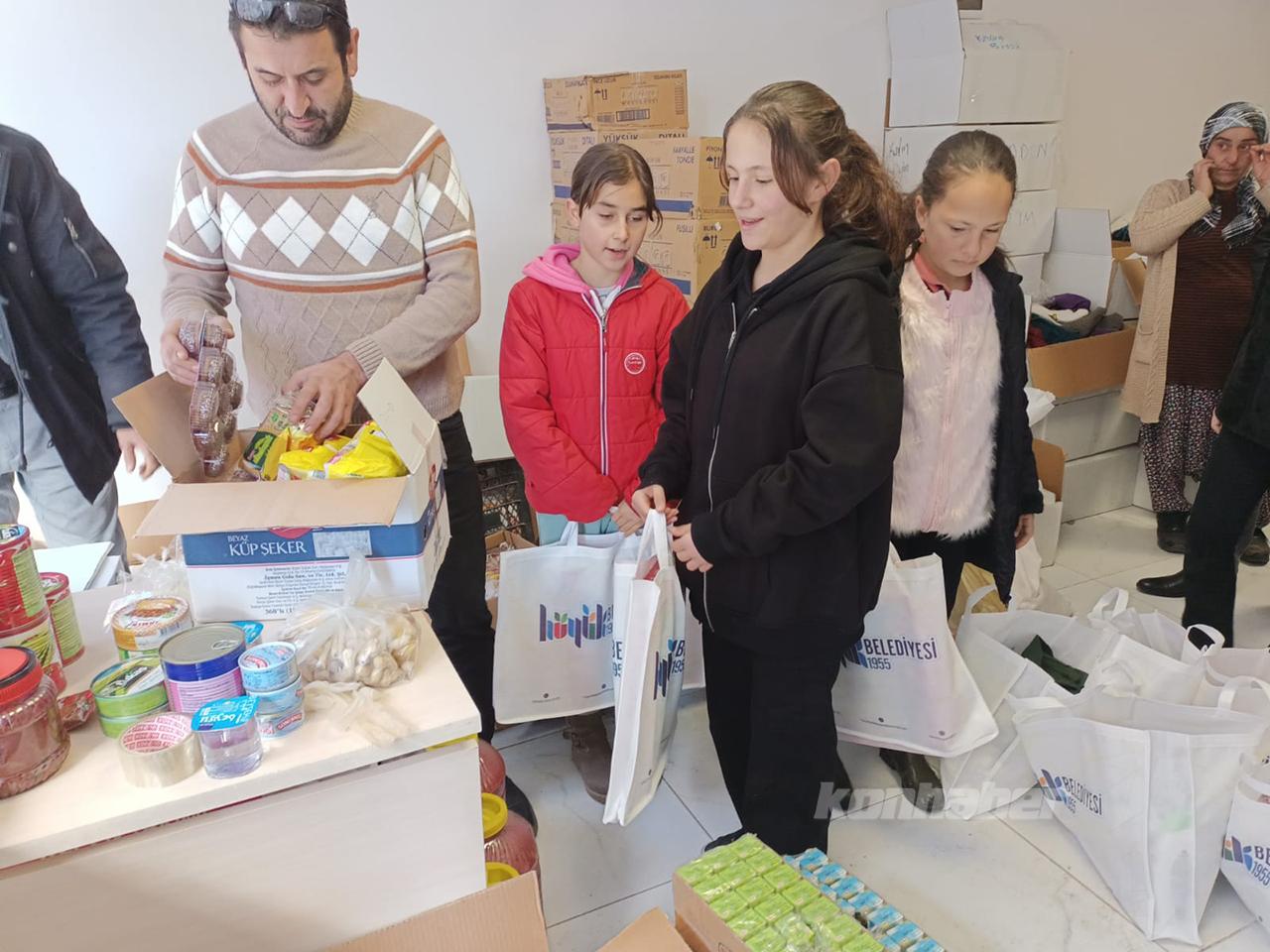Adları Yağmur, İlayda ve Ayşe olan 3 ilkokul öğrencisi okul harçlıklarıyla yaptıkları 1 koli yardım malzemesini belediyenin deprem bölgesi için insani yardımları toplandığı depoya bırakmaya geldi.