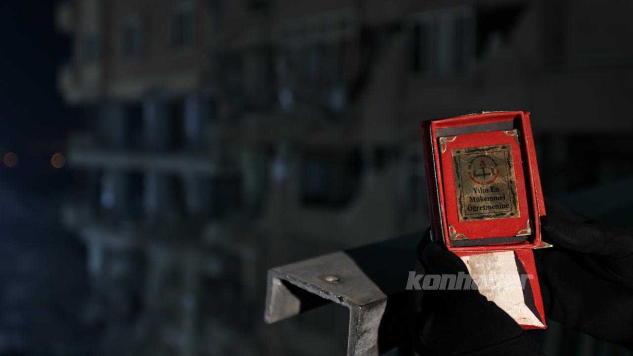 Fotoğraflar arasında bulunan küçük bir kız çocuğunun "Benim annem bir melek" yazısının önünde çektirdiği kare ile "Yılın En Mükemmel Öğretmeni"ne yazılı küçük plaket, depremin geride bıraktığı acı izler arasında yer aldı.