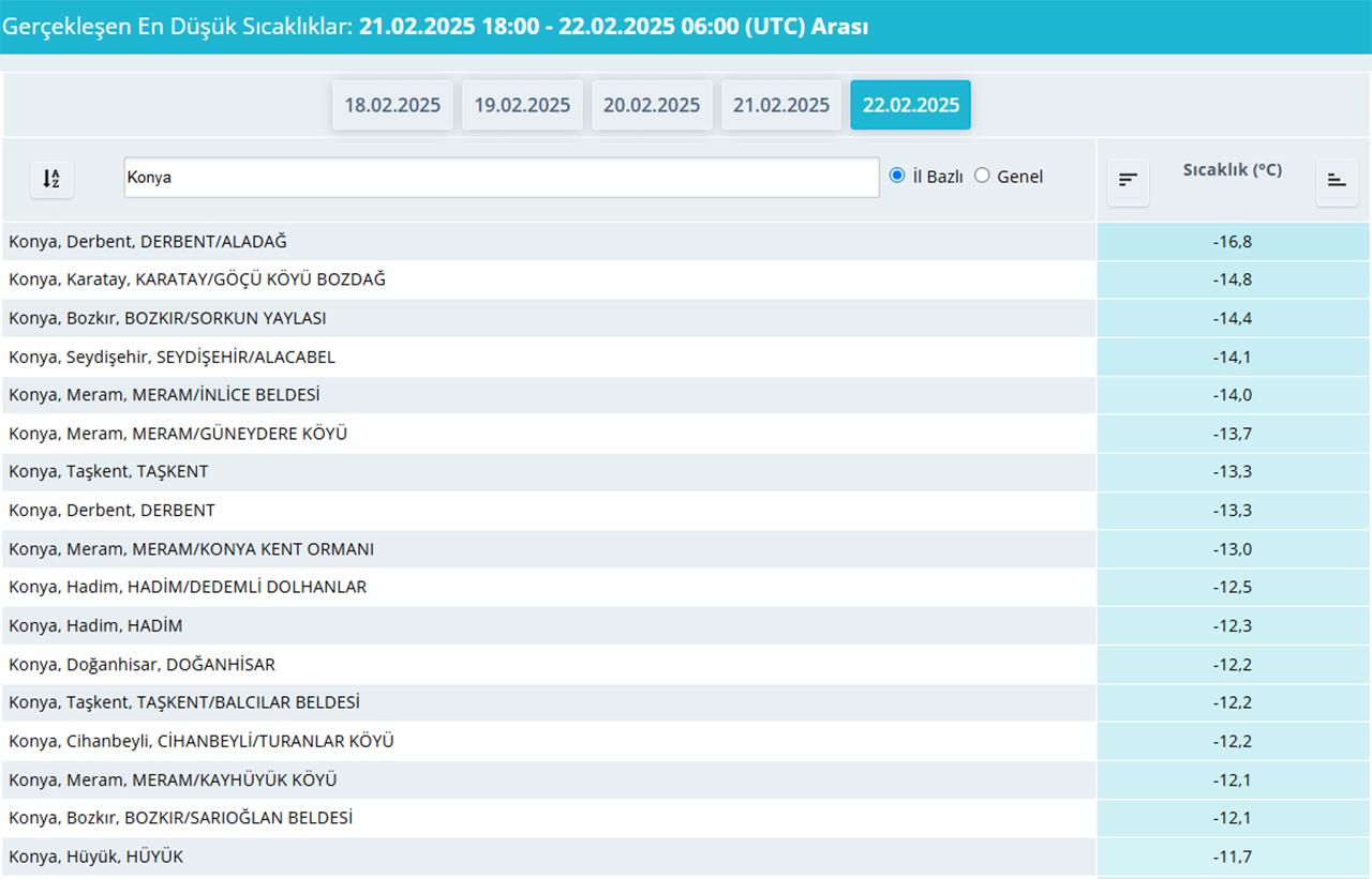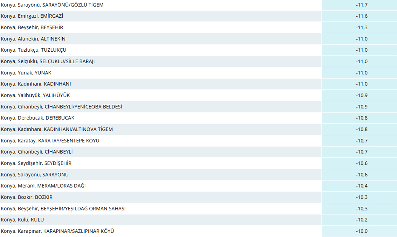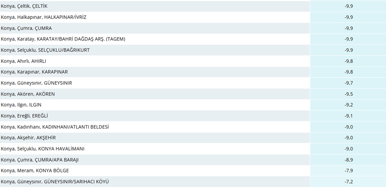 Meteoroloji Genel Müdürlüğünden alınan bilgilere göre Konya’nın en soğuk ilçesi geride bıraktığımız saatlerde sıfırın altında -16,8 dereceyle Konya, Derbent-Aladağ oldu. Derbent ilçesini sırasıyla eksi 14,8 dereceyle Karatay (Göçü Köyü Bozdağ), eksi 14,4 dereceyle Bozkır (Sorkun Yaylası), eksi 14,1 dereceyle Seydişehir (Alacabel), eksi 14,0 dereceyle Meram (İnlice beldesi) takip etti.