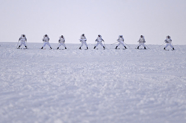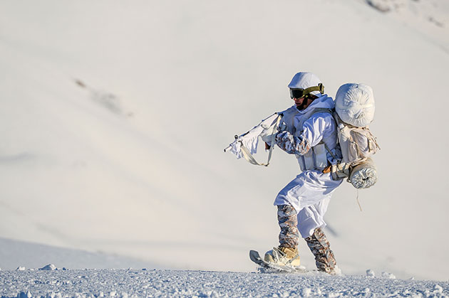Dağlık bölgede eğitimlerini sürdüren komandolar, karda batmamak için ayaklarına özel yapım kar hedikleri takarak silah ve teçhizatlarını kış şartlarına uygun kamufle ediyor.