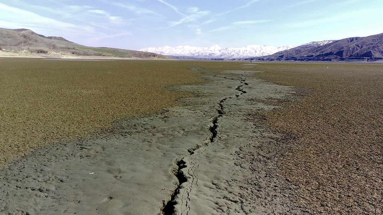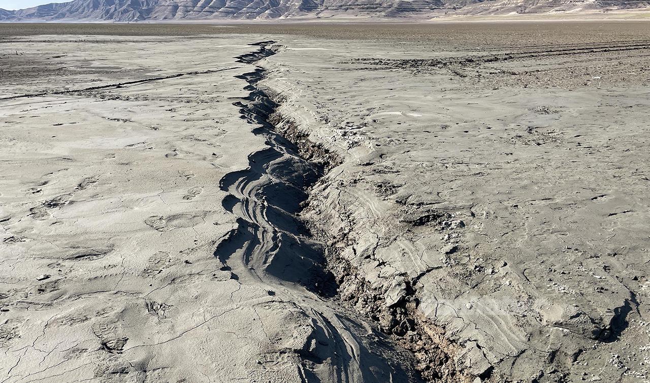 Elazığ'da 17 Şubat'ta meydana gelen 4,6 büyüklüğündeki depremin ardından suların çekildiği Keban Baraj Gölü sahasındaki yaklaşık 20 kilometrelik fay hattında yarıklar oluşturan zemin sıvılaşması dron ile görüntülendi.