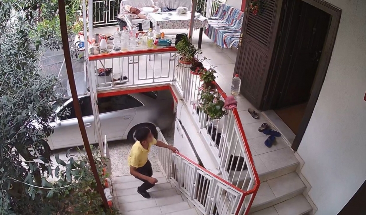 Öte yandan şahsın eve girişi ve hırsızlık yapma anları güvenlik kameraları tarafından saniye saniye görüntülendi. Rahat bir şekilde eve giren şüpheli, önce ayakkabıları çalmak için hamle yapıyor. Daha sonra M.Y.'nin uykuda olduğunu fark eden şahıs, yavaşça yukarı çıkarak, masanın üzerinde bulunan cep telefonunu alıyor. Ardından uyuyan adamın çantasını karıştıran, kısa bir süreliğine evin içine de giren şahıs, bir ses duyması üzerine bölgeden koşarak uzaklaşıyor.