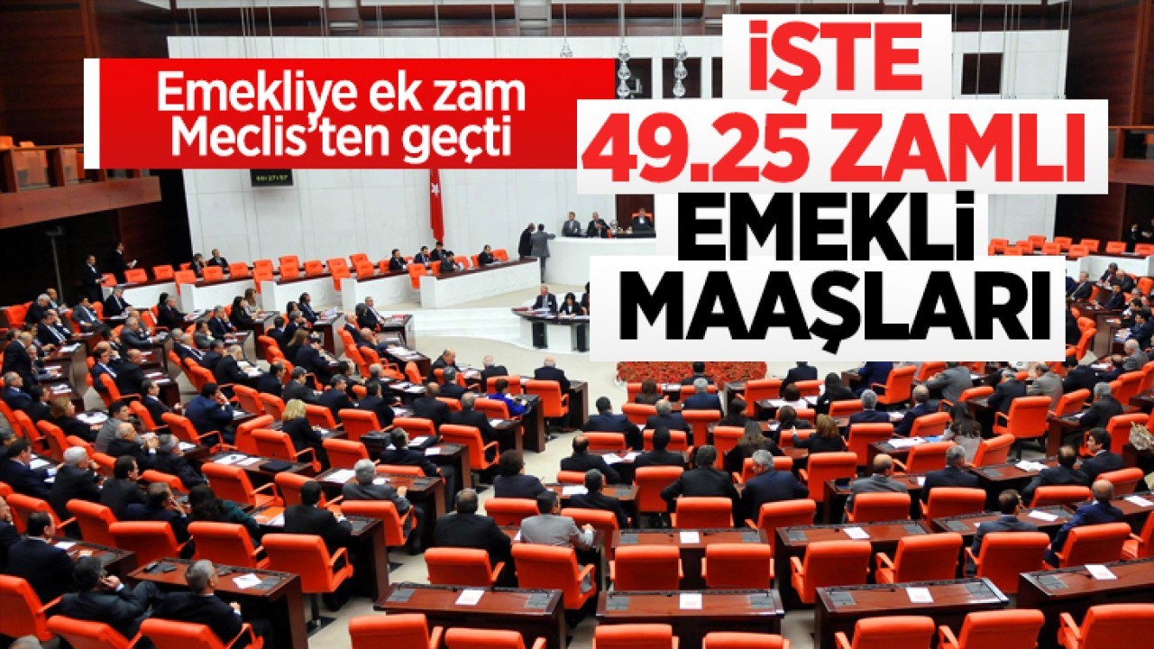 TBMM Genel Kurulunda görüşmeleri süren çalışma hayatına dair kanun teklifinin, işçi emekli aylıklarına yapılacak artışın yüzde 49,25'e çıkarılmasını düzenleyen maddesi kabul edildi. Uygulanan yüzde 49.25 zamla yeni emekli maaşları ne kadar olacak? İşte detaylar...