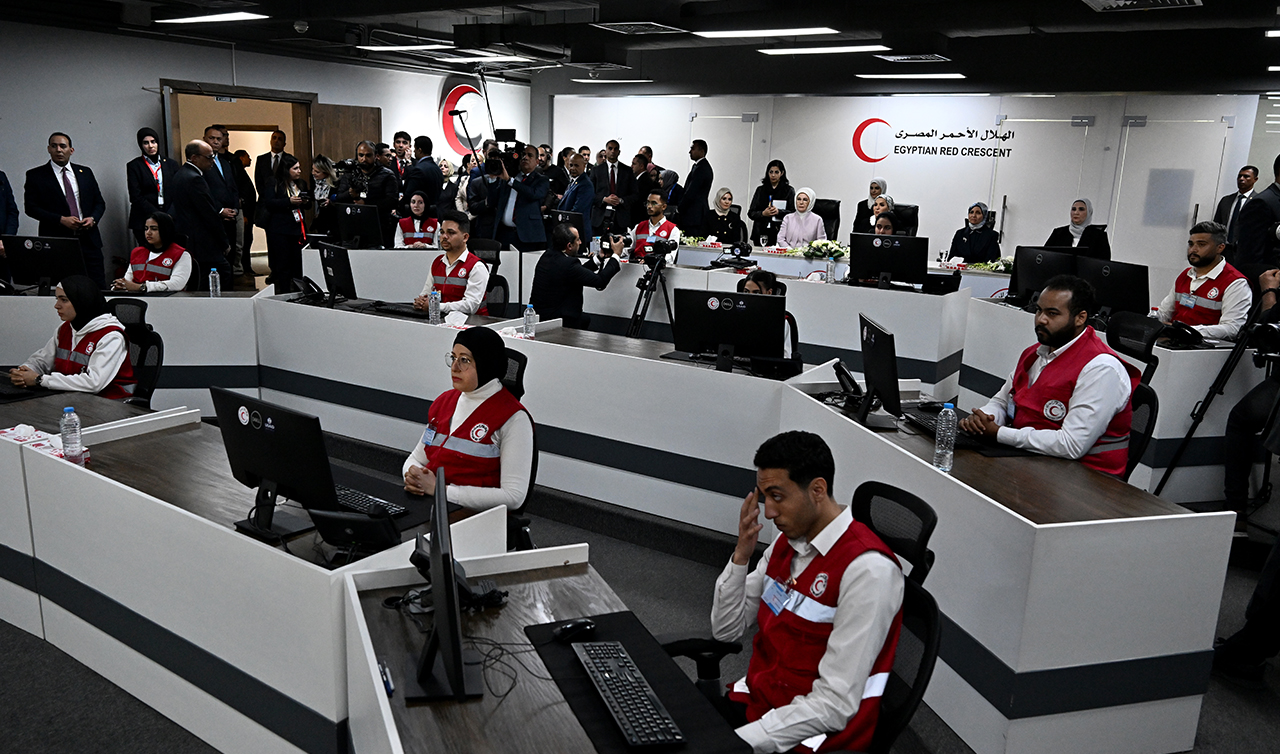 İlk olarak Mısır Kızılayı'nı ziyaret eden Emine Erdoğan çalışmalara ilişkin bilgi aldı ve Gazze'ye yapılan yardımlara ilişkin tanıtım filmini izledi.