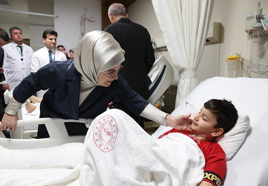 Emine Erdoğan, "Çam ve Sakura Şehir Hastanesi'nde tedavi gören depremzede vatandaşlarımızı ziyaret ettik. Kaybettiğimiz vatandaşlarımızın acısını yüreğimizde taşırken, gözyaşlarımızı birlik ve beraberlikle dindireceğiz." ifadelerini kullandı.