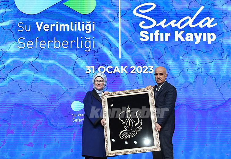 Su Verimliliği Seferberliği'ne ilişkin tanıtım filminin de gösterildiği programda Tarım ve Orman Bakanı Vahit Kirişci, Emine Erdoğan'a geleneksel Maraş işi tel kırma ibrik figürlü tablo hediye etti.