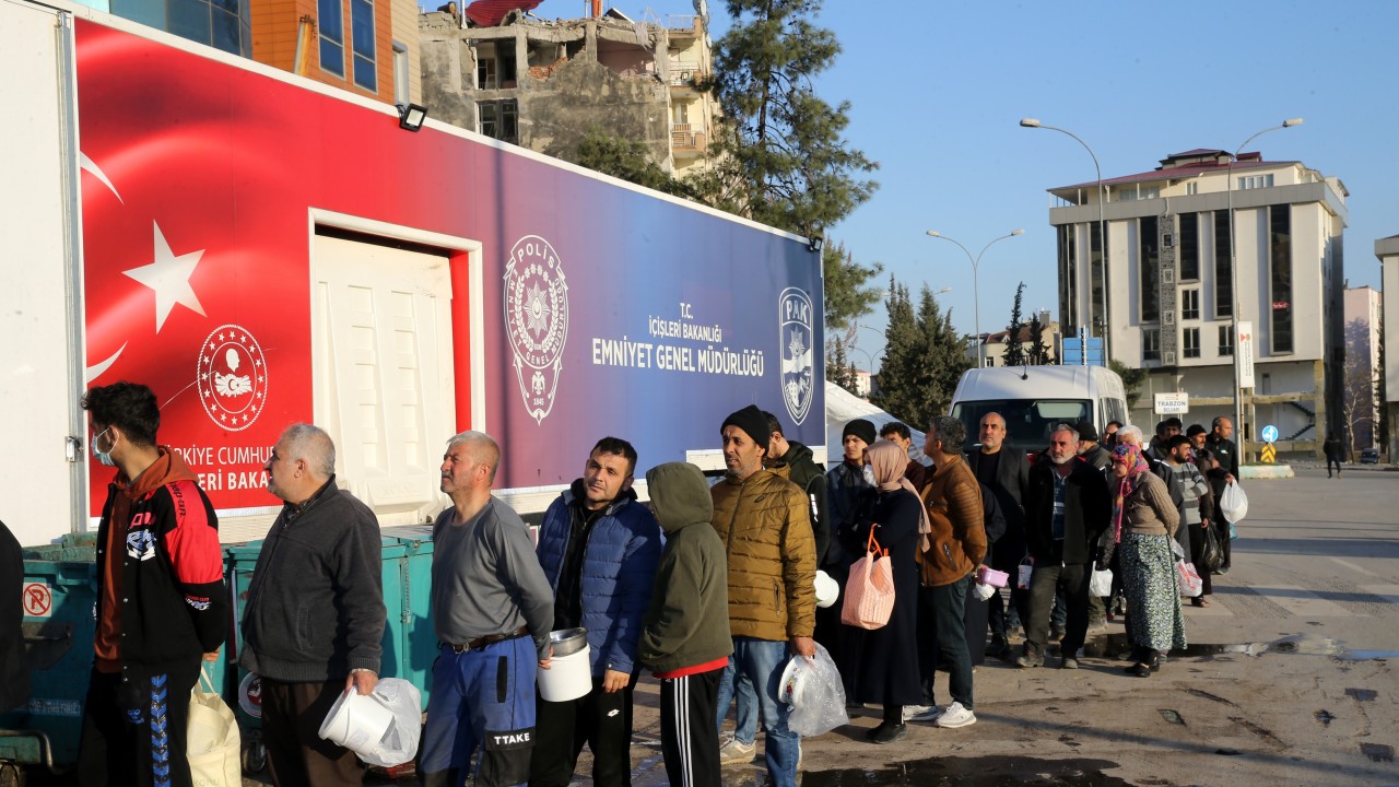 Emniyet Genel Müdürlüğü Sosyal Hizmetler ve Sağlık Daire Başkanlığı koordinasyonunda depremin ilk gününden itibaren tırlardan depremzedelere sıcak yemek dağıtımı yapılıyor.