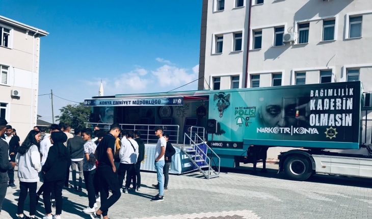 Konya İl Emniyet Müdürlüğü Narkotik Şube ekipleri tarafından uyuşturucu kullanımının zararları konusunda vatandaşları bilinçlendirmek üzere görsel olarak tasarlanan narkotik tırı Kadınhanı ilçesine geldi.