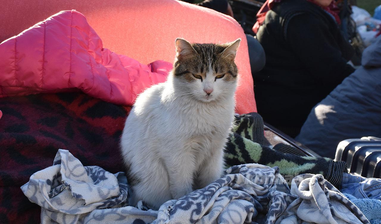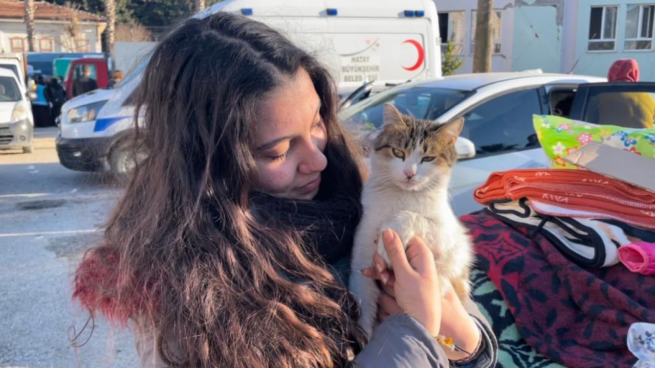 Kahramanmaraş merkezli depremlerin etkilediği Hatay'da yaşadıkları evi ailesiyle terk eden Sudenur-Yusuf Ziya Sürer kardeşlerin enkaz altında buldukları kedi, bir an olsun yanlarından ayrılmayıp aileye moral desteği oluyor.