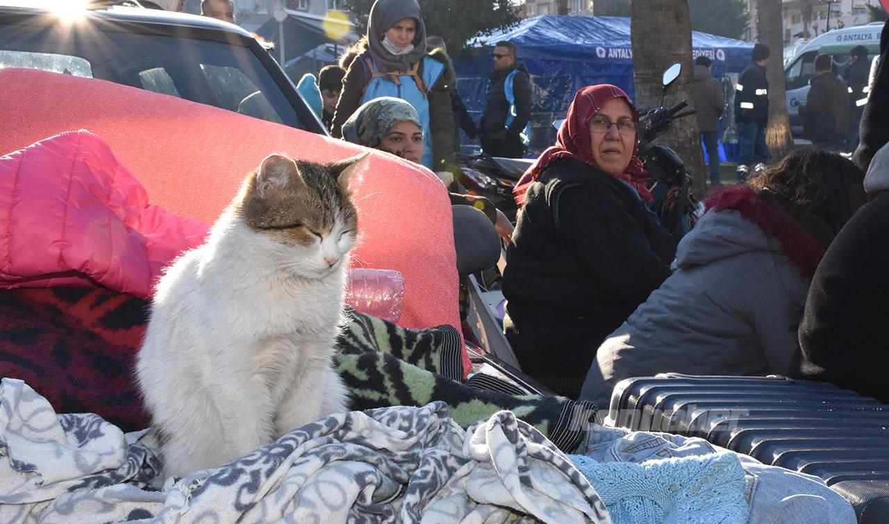 Hatay Büyükşehir Belediyesi Cenaze Hizmetleri Müdürlüğü önünde Türkiye Diyanet Vakfınca (TDV) depremzede aileler için kurulan hizmet alanında bulunan Sürer ailesine "Acıbal" adını verdikleri kedi de eşlik ediyor.