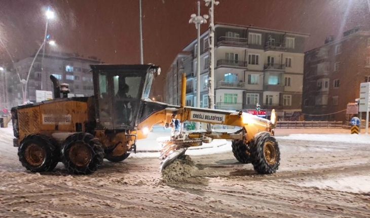 Ereğli Belediyesi ekipleri, kar yağışıyla birlikte gece gündüz tuzlama ve kar küreme çalışmalarını sürdürüyor. Belediye ekipleri, kar yağışının olumsuz etkilerini ortadan kaldırmak adına yoğun çaba sarf ediyor.