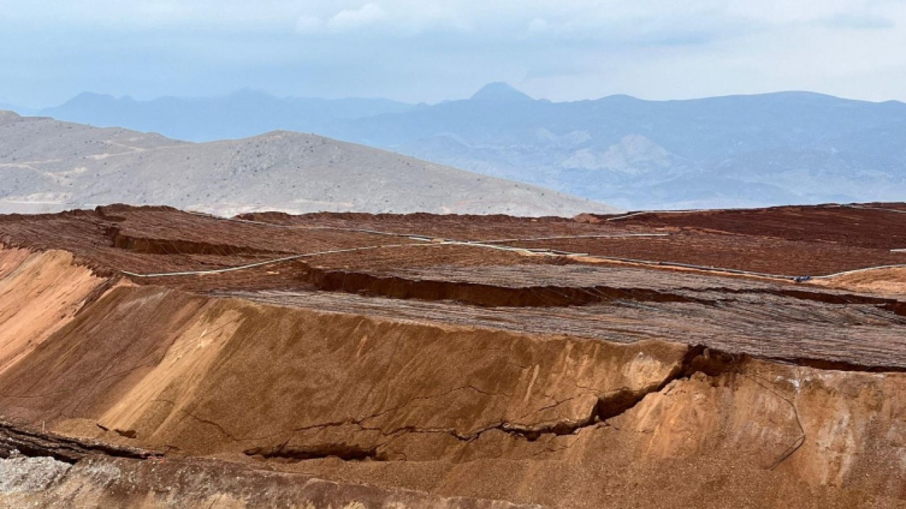 Fotoğraflarda, yığın liç alanında biriktirilen topraklarda derin yarıkların oluştuğu görülüyor.