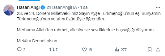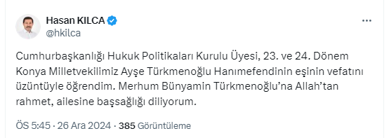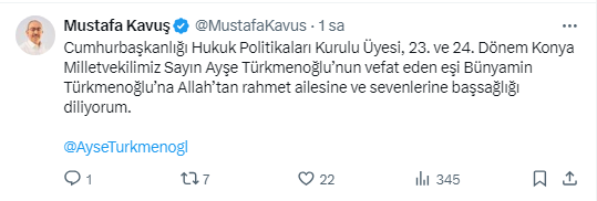 23. ve 24. Dönem Konya Milletvekili Ayşe Türkmenoğlu'nun eşi, İl Başkan Yardımcısı Mehmet Türkmenoğlu'nun amcası Bünyamin Türkmenoğlu yaşamını yitirdi.