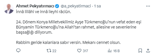 Eski AK Parti Konya Milletvekili ve Cumhurbaşkanı Başdanışmanı Ayşe Türkmenoğlu’nun eşi Bünyamin Türkmenoğlu vefat etti.