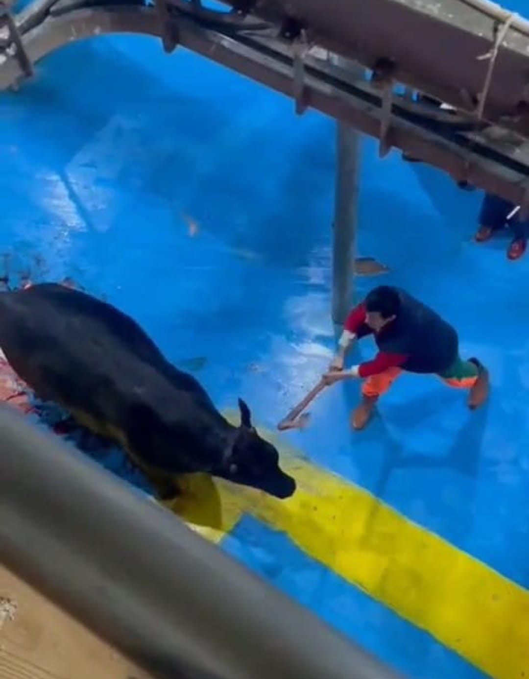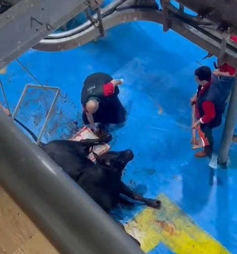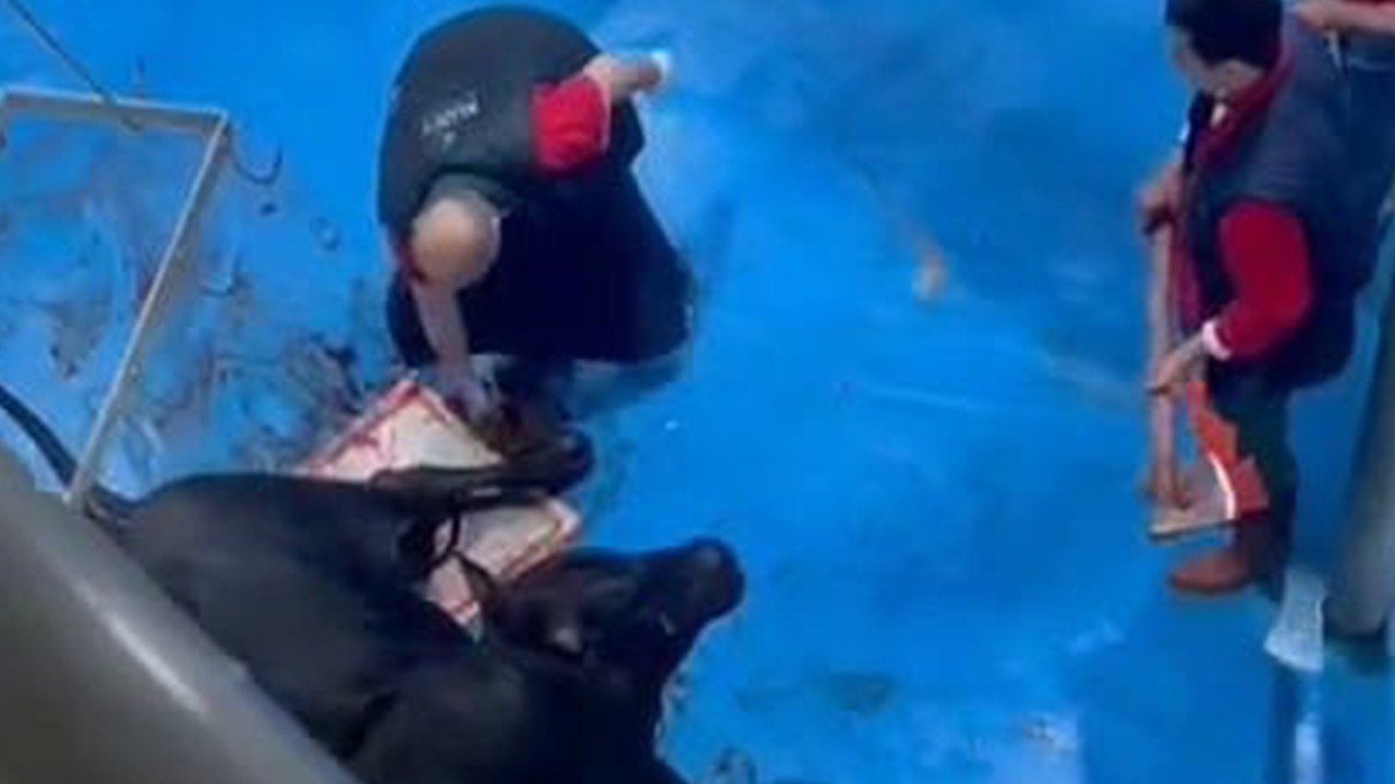 Amasya'da bir et entegre tesisinde görevli iki kişinin, kesim öncesi sakinleşmeyen büyükbaş hayvana yaptığı eziyet tepki çekti. Görevlilerden biri hayvanı bayıltmak için başına defalarca kez baltayla vurdu. Diğer görevli ise hayvana birkaç defa bıçak batırdı. Olaya ilişkin 5 kişi gözaltına alındı.