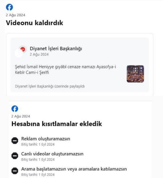 Facebook, Diyanet İşleri Başkanlığı'nın İsmail Haniye için kılınan gıyabi cenaze namazı paylaşımını kaldırdı ve hesabı kısıtladı.