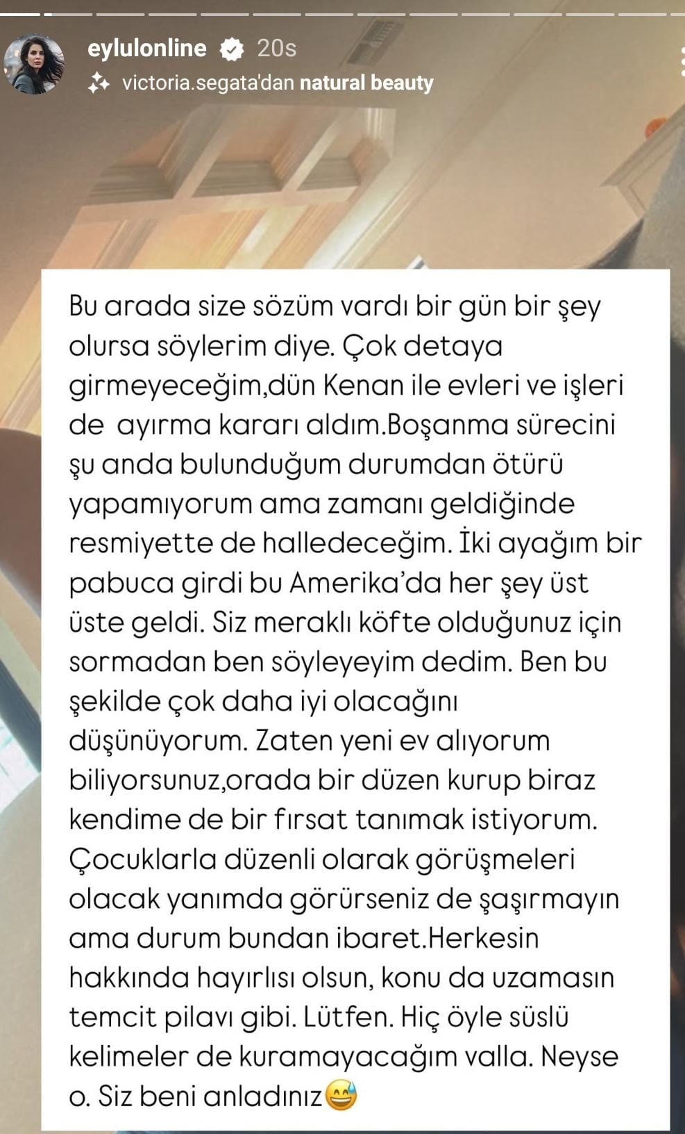 "Bu arada size sözüm vardı bir gün bir şey olursa söylerim diye. Çok detaya girmeyeceğim, dün Kenan ile evleri ve işleri de ayırma kararı aldım. Boşanma sürecini şu anda bulunduğum durumdan ötürü yapamıyorum ama zamanı geldiğinde resmiyette de halledeceğim.