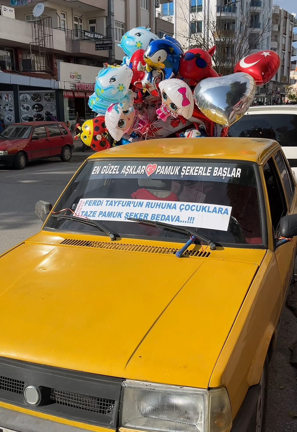 Tezgahının önüne park edip, üzerine 'Ferdi Tayfur'un ruhuna çocuklara taze pamuk şeker bedava' yazdığı otomobilden de Ferdi Tayfur şarkıları çalan Sait Kocakaya, sanatçının hayrına özellikle çocuklara pamuk şeker verdi.