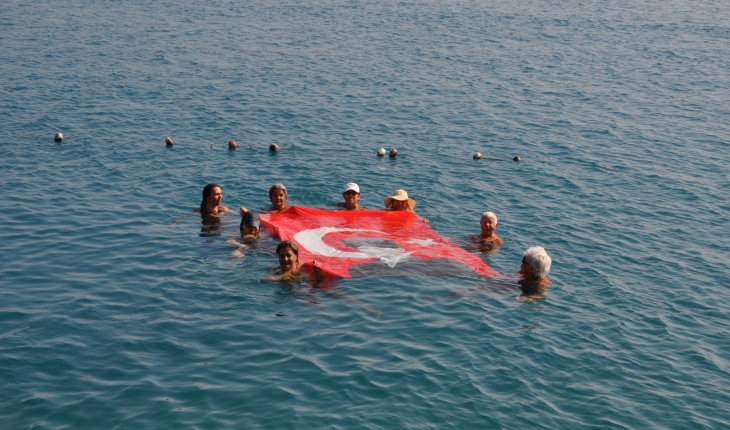 Antalya’nın Finike ilçesinde 30 Ağustos Zafer Bayramı etkinlikleri kapsamında bir grup kadın, denize girerek Mustafa Kemal Atatürk’ünde resminin bulunduğu Türk Bayrağını açarak 30 Ağustos’u kutladı.