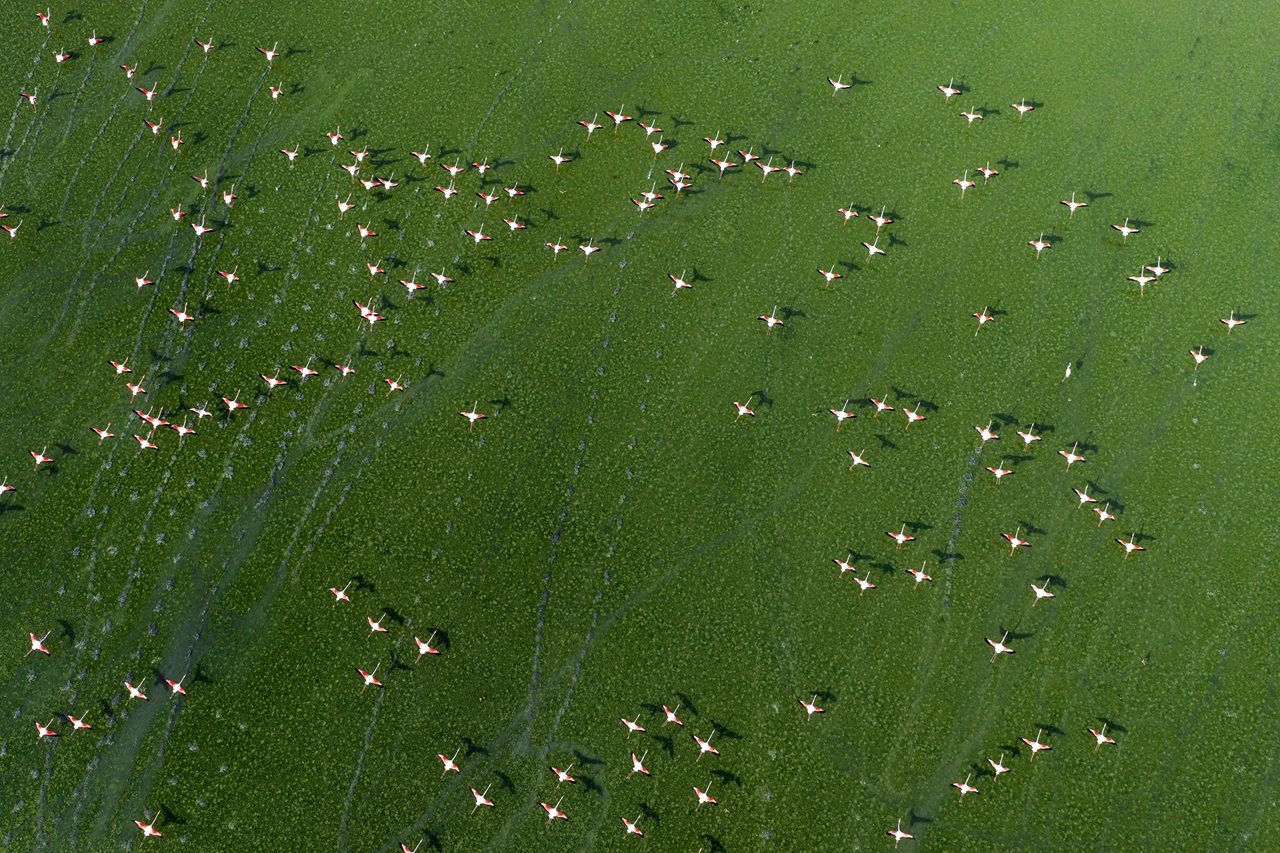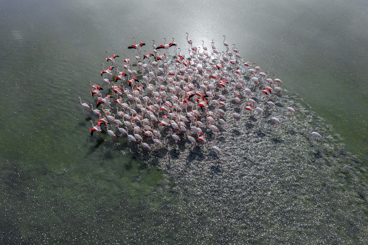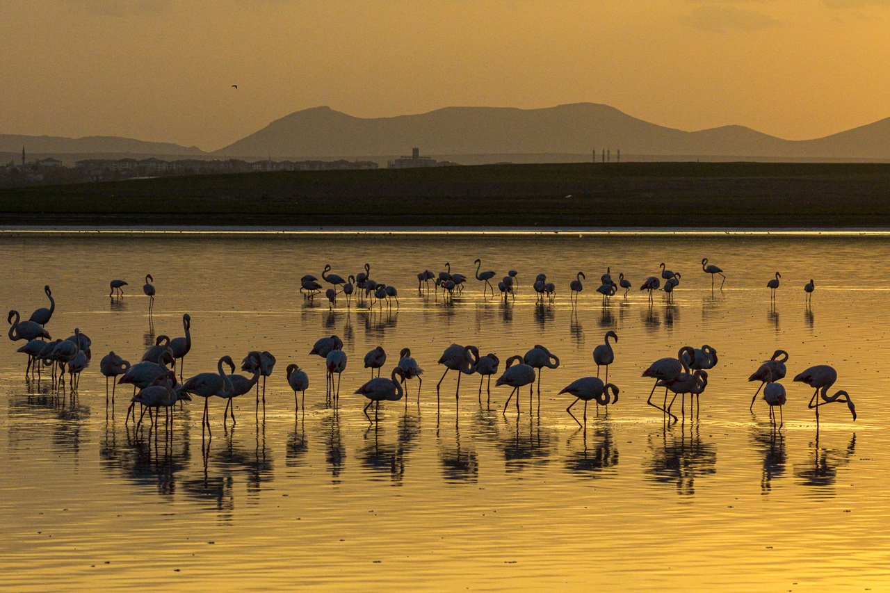 Uzun bacakları ve pembe tüyleriyle dikkat çeken flamingolar, gün doğumu ve gün batımında gölde adeta kartpostallık görüntüler oluşturdu.