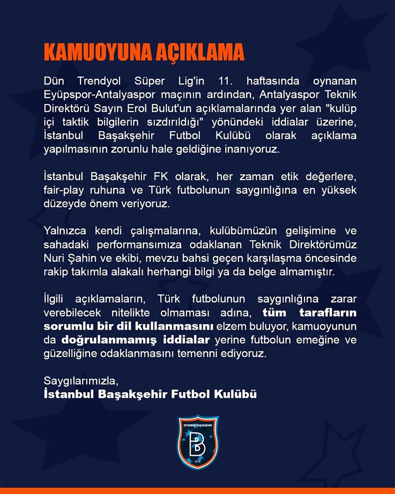 Erol Bulut'un casusluk açıklamalarının ardından Başakşehir cephesinden yanıt geldi.