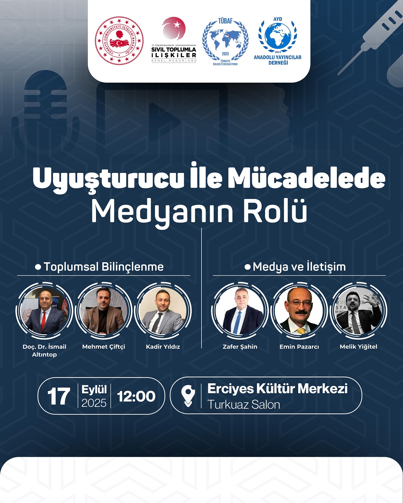 Anadolu Yayıncılar Derneği tarafından organize edilen, Türkiye Basın Federasyonu katkılarıyla ve İçişleri Bakanlığı Sivil Toplumla İlişkiler Genel Müdürlüğü desteğiyle gerçekleştirilecek olan “Uyuşturucu ile Mücadelede Medyanın Rolü 2025 Paneli” Kayseri ve Van’da yapılacak.