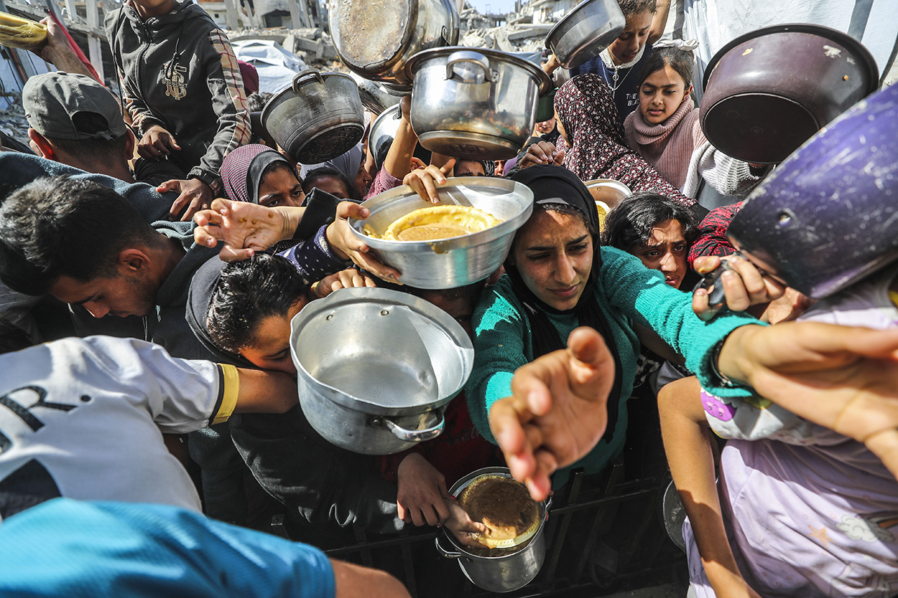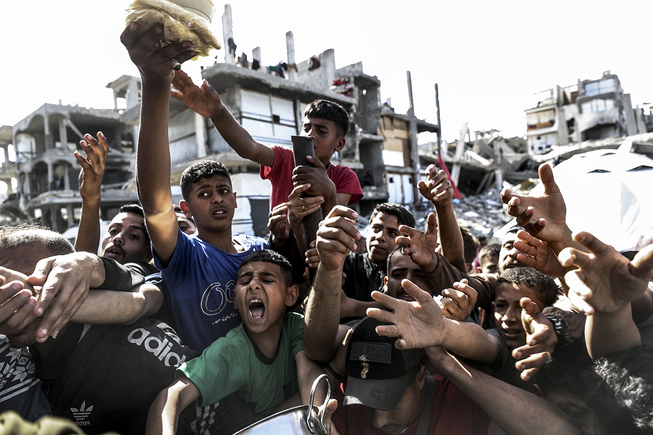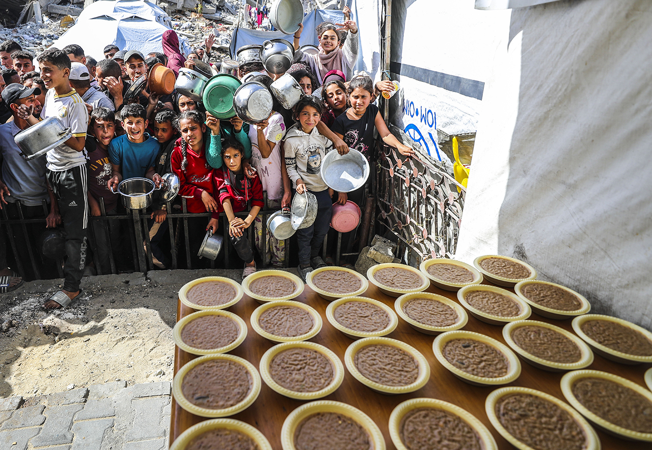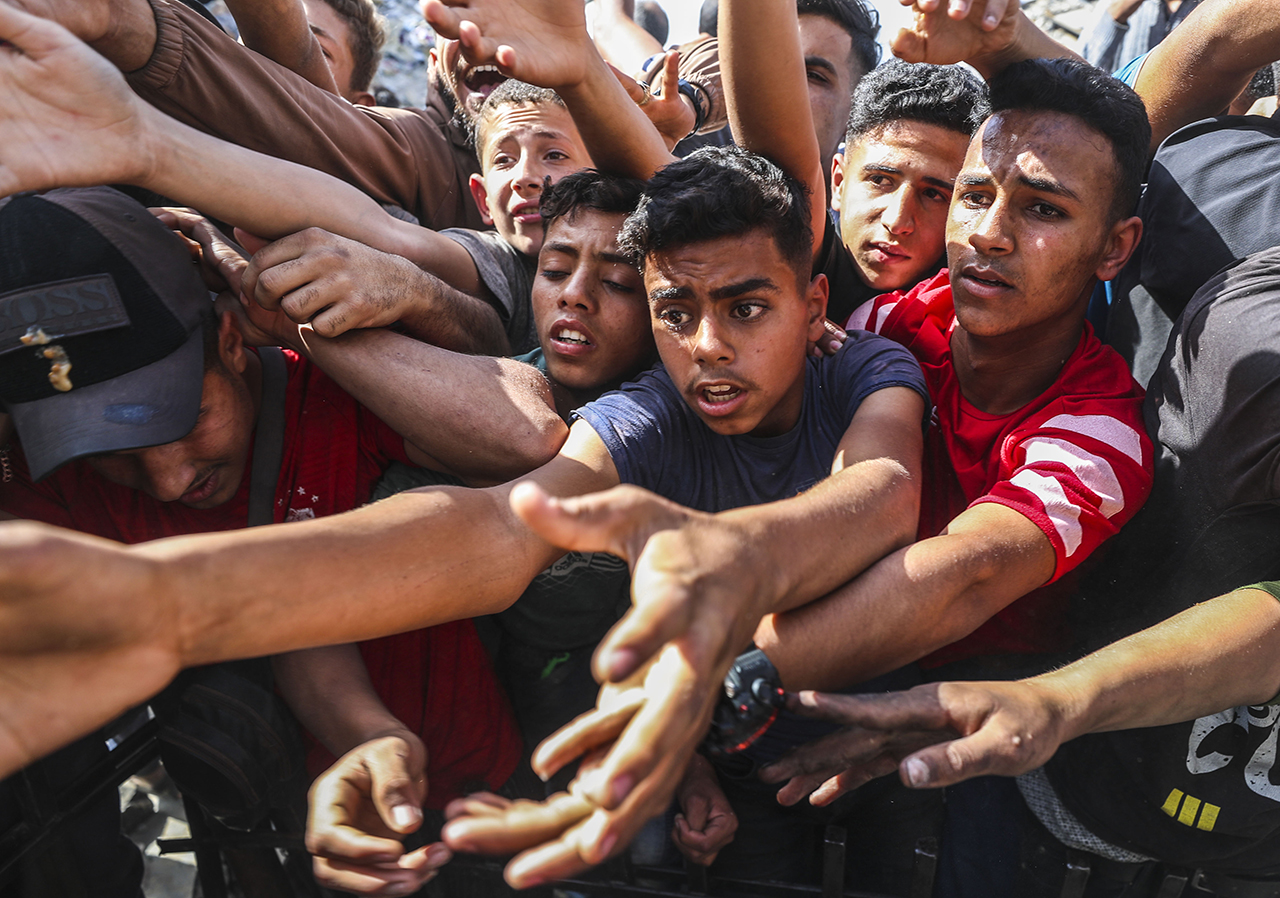 Bazı hayır kurumları, Gazze'nin kuzeyindeki Cibaliya Mülteci Kampı'ndaki Filistinlilere yemek dağıttı. Yiyecek bulmakta zorluk çeken Filistinliler, dağıtılan yemeklerden alabilmek için yoğunluk oluşturdu.