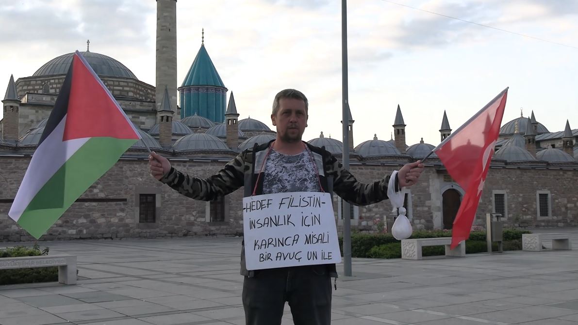 Eskişehirli esnaf İrfan Başkaya, Filistin’de yaşanan insanlık dramına dikkat çekmek amacıyla başlattığı “Gazze Yürüyüşü”ne Konya’da devam ediyor.
