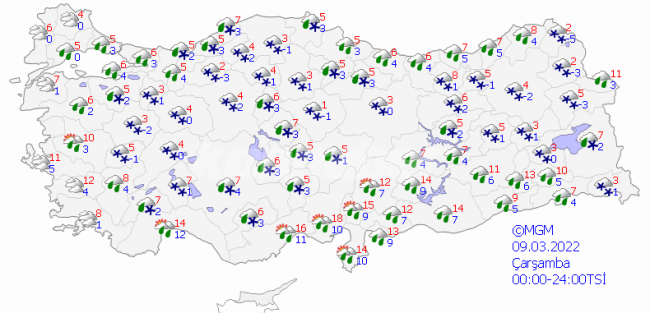 Çarşamba günü, mevsim normalleri civarında seyreden hava sıcaklıklarının hissedilir derecede düşmesiyle birlikte kıyı kesimlerde yağmur, iç kesimlerde ise yer yer yoğun kar yağışı görülecek. Günün en yüksek sıcaklık değerleri, Ankara'da 2-4, İstanbul'da 4-5, İzmir'de 11-7, Konya'da 0-7, Sivas'ta 0-3, Samsun'da 4-5, Diyarbakır'da 10-11, Antalya'da 11-14, Van'da 6-7 derece olacak.