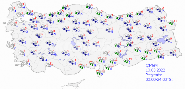 Meteoroloji Genel Müdürlüğü tarafından yapılan son değerlendirmelere göre bugün, Marmara, Ege(Afyonkarahisar hariç), Akdeniz, İç Anadolu’nun güneyi, Doğu Anadolu’nun güneyi, Güneydoğu Anadolu, Doğu Anadolu’nun kuzeydoğusu, Doğu Karadeniz’in doğusu ile Ankara, Eskişehir ve Düzce çevrelerinin yağışlı geçeceği tahmin ediliyor. Genellikle yağmur ve sağanak, Doğu Akdeniz’in Toroslar kesimi, Doğu Anadolu’nun kuzeydoğusu ile Hakkari ve Bitlis çevrelerinin karla karışık yağmur ve kar şeklinde olması beklenen yağışların; Kıyı Ege ile Edirne Manisa çevrelerinde yerel olarak kuvvetli olması bekleniyor.
