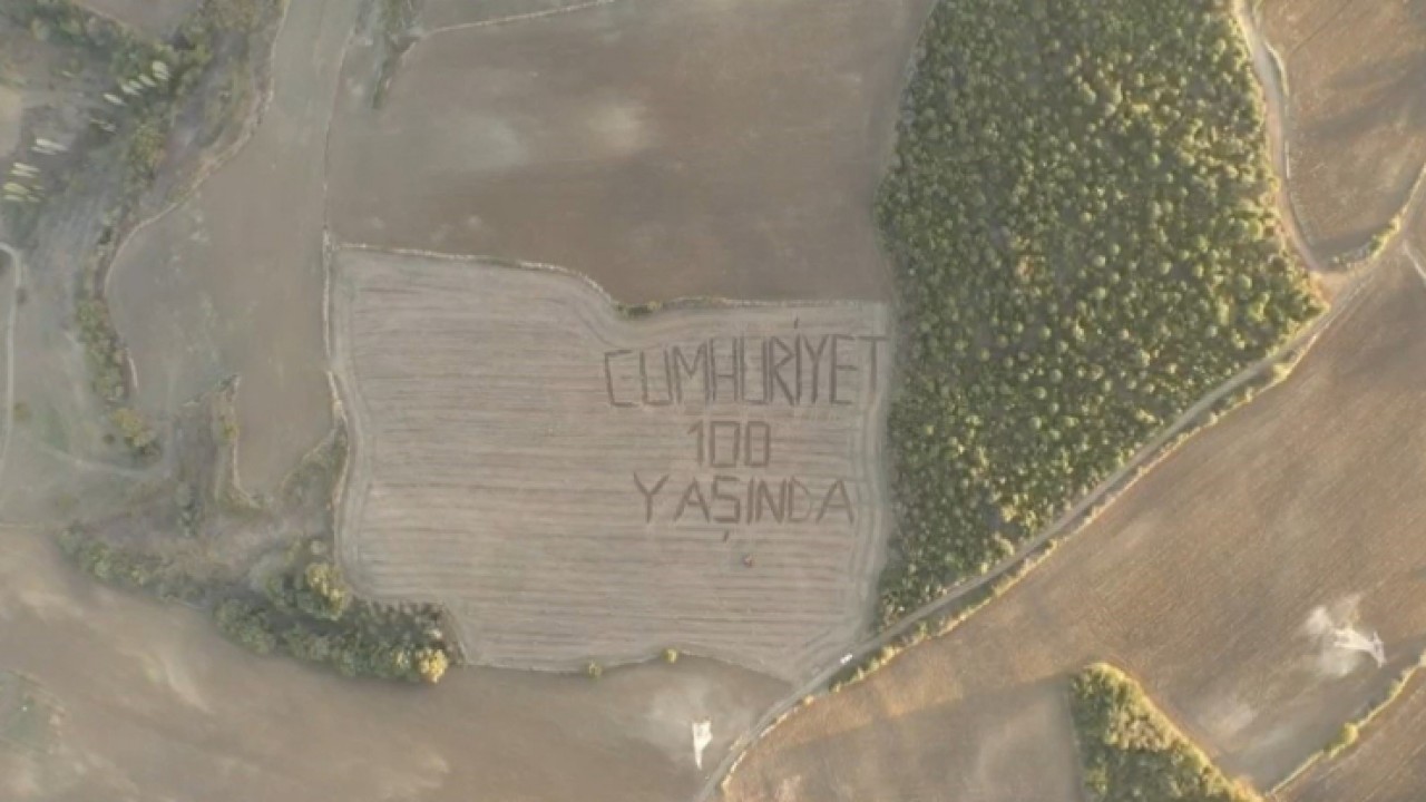 Çanakkale'nin Lapseki ilçesine bağlı Kocaveli köyünde yaşayan genç çiftçi, tarlasına traktörle "Cumhuriyet 100 yaşında" yazdı.