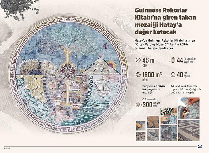 Savaş, eserin "dünyanın en büyük tek parça taban mozaiği" olarak Guinness Rekorlar Kitabı'na girmesi için yaptıkları başvurunun olumlu sonuçlanmasını memnuniyetle karşıladıklarını ifade ederek, rekor duyurusunun Hatay'ın ana vatana katılışının 83'üncü yıl dönümünde yapılmasının sevinçlerini artırdığını anlattı.
