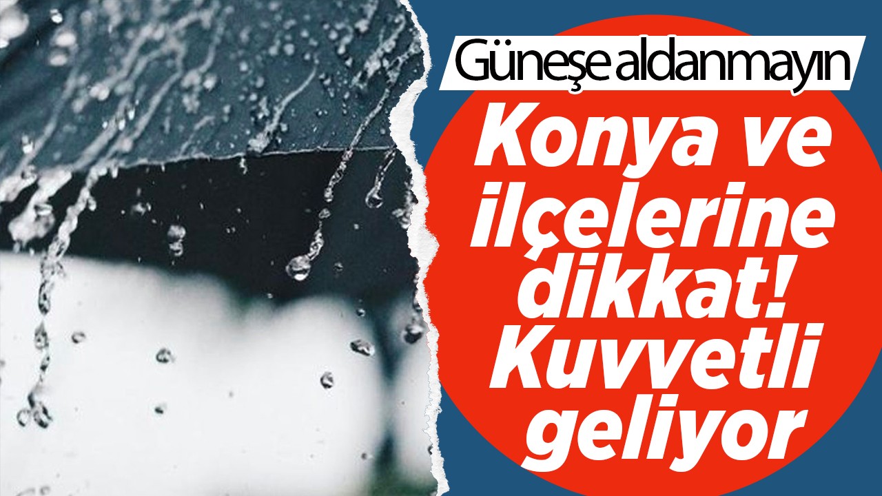 Konya ve çevresinde öğle saatlerinden itibaren sağanak yağışların kuvvetli olacağı tahmin ediliyor. Ani sel, su baskını, yıldırım, yerel dolu yağışı, ulaşımda aksamalar, kuvvetli rüzgar gibi olumsuzluklara karşı dikkatli ve tedbirli olunması gerekiyor.
