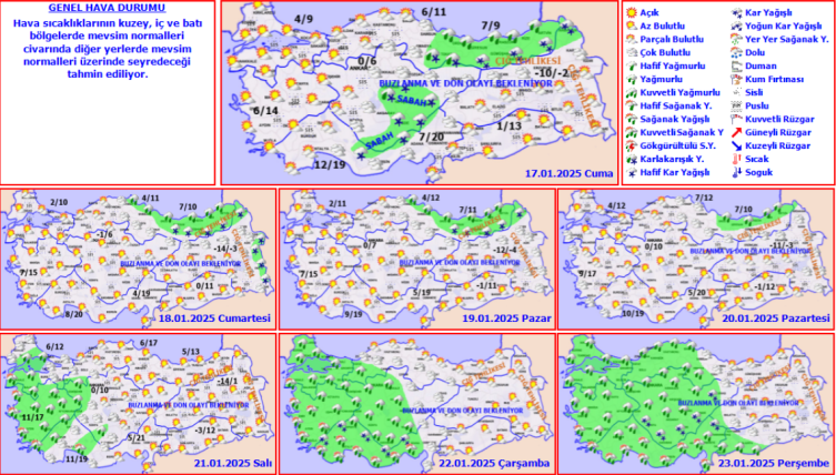 Meteoroloji Genel Müdürlüğünden alınan tahminlere göre yurdun iç ve doğu kesimlerinde buzlanma ve don ile birlikte pus ve yer yer sis bekleniyor.