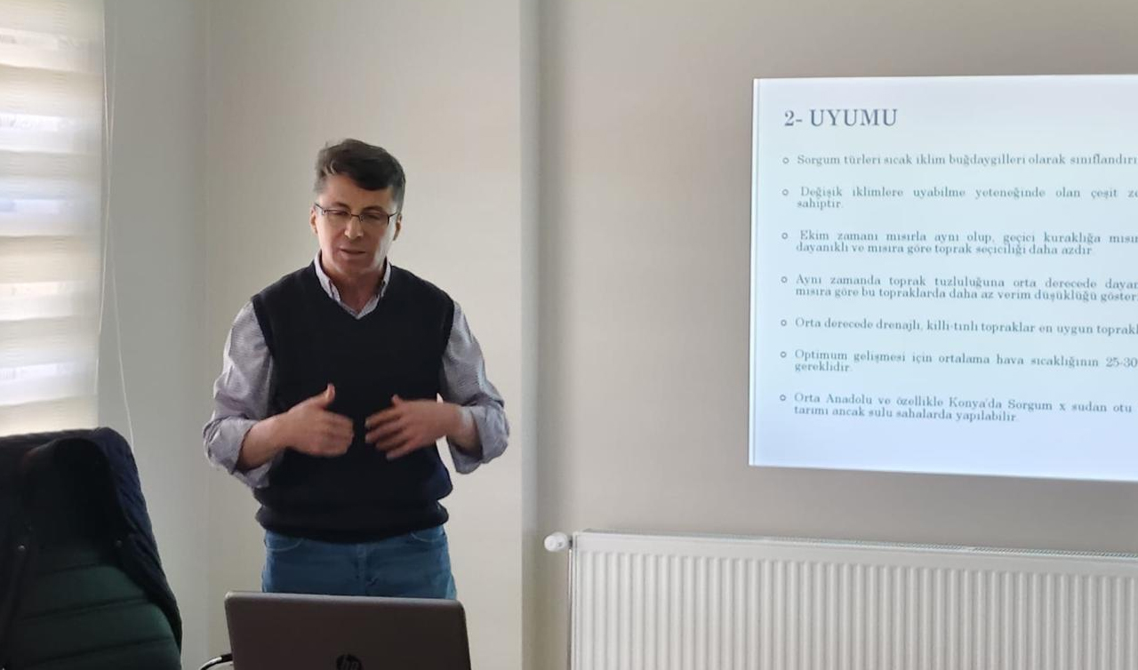 TAKE Projesi çerçevesinde Halkapınar'da gerçekleştirilen eğitimde, mısıra güçlü bir alternatif olarak gösterilen Silajlık Sorgum Sudan Otu üretimi ele alındı. Programda üreticilere bitkinin yetiştirme teknikleri, su tüketimi, verim potansiyeli ve üretim planlaması hakkında bilgi verildi.