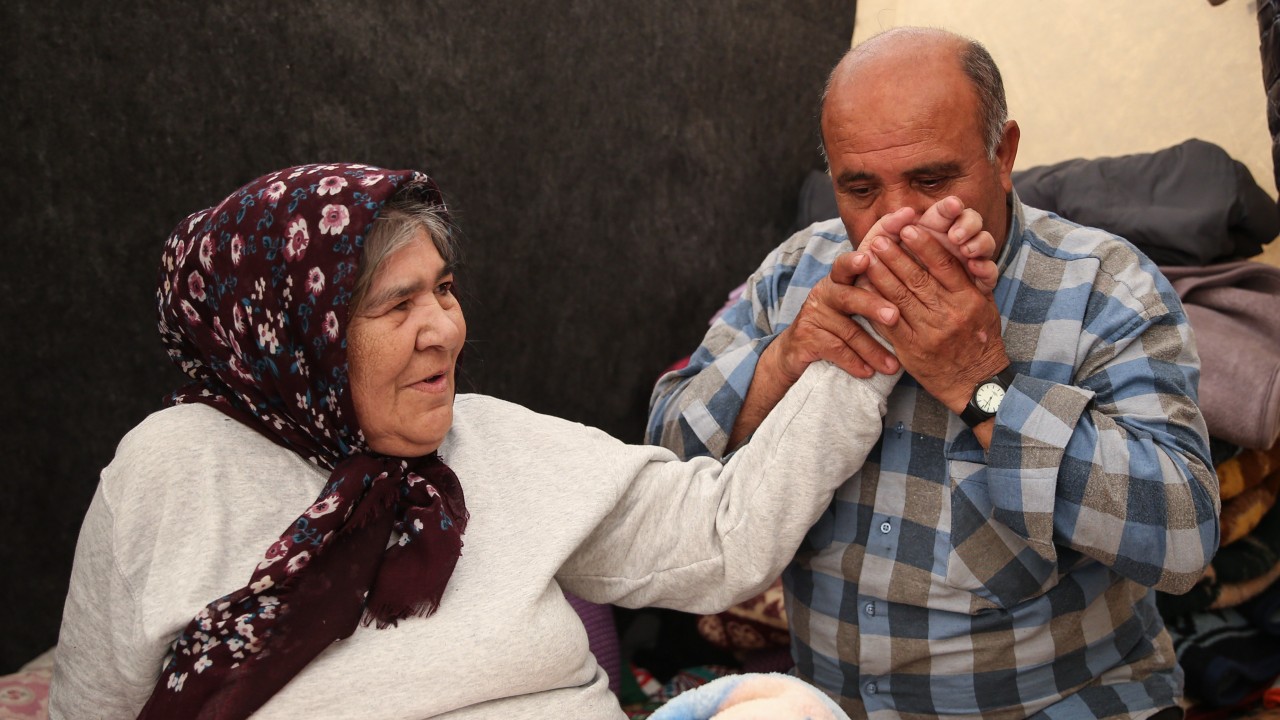 Kahramanmaraş'taki evleri, 6 Şubat'taki depremlerde hasar gören 56 yaşındaki Ahmet Bozdere, düşünmeden binaya girip kurtardığı felçli eşine, sığındıkları çadır kentte bakıyor.