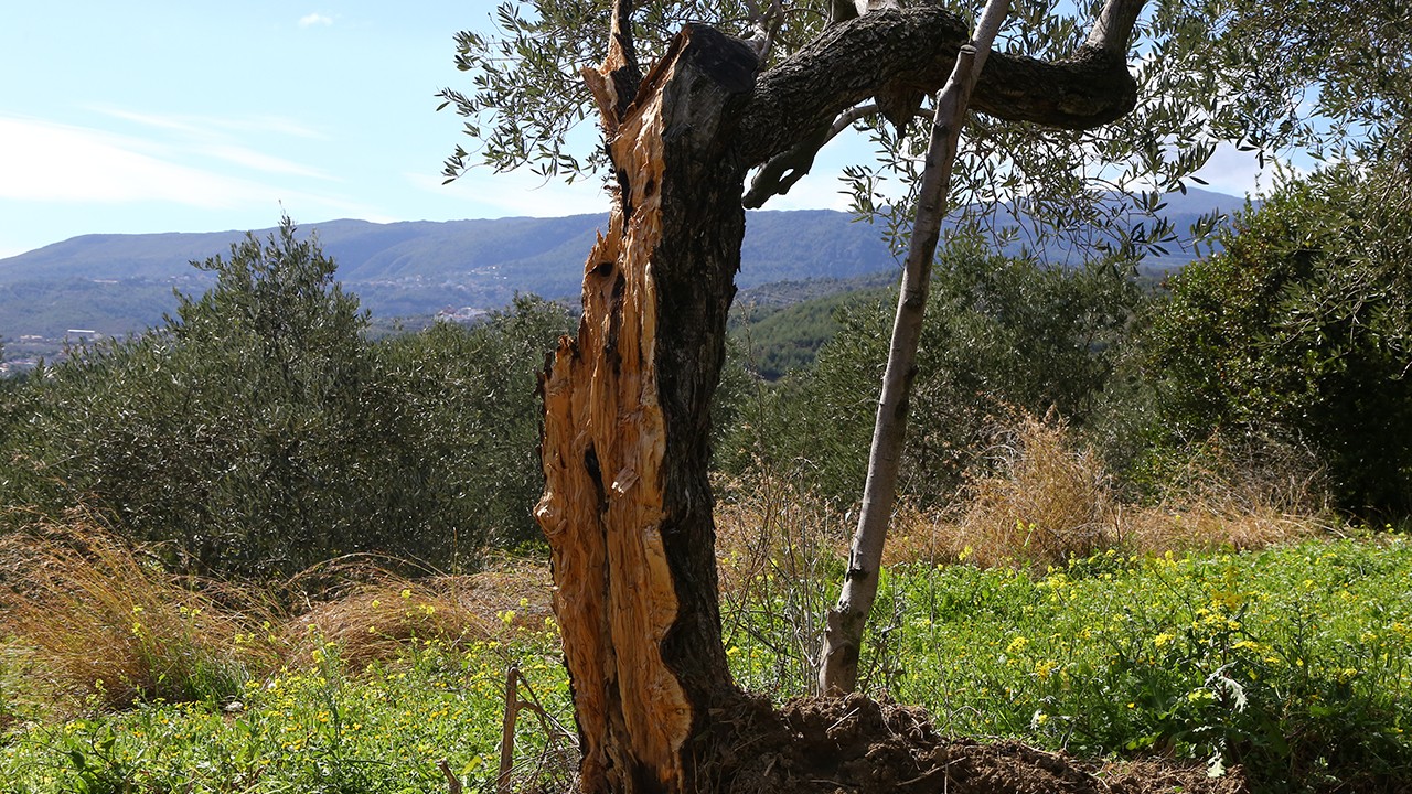Bahçedeki yarıkla kökünden bölünen 80 yıllık zeytin ağacının iki parçası, birbirinden yaklaşık 15 metre ayrıldı.