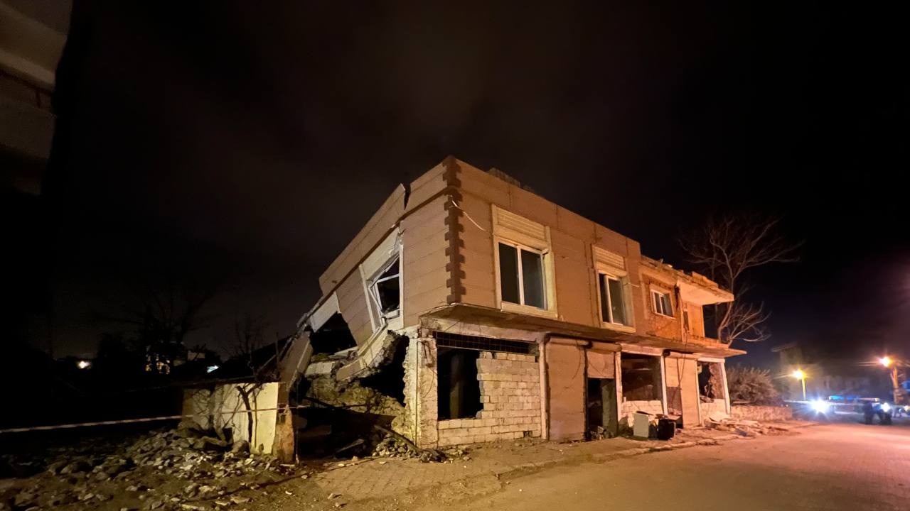 Osmaniye'nin Düziçi ilçesinde, Kahramanmaraş merkezli depremlerden etkilendiği için boşaltılan 2 katlı binanın bir bölümü, merkez üssü Hatay'ın Defne ilçesi olan deprem nedeniyle çöktü.